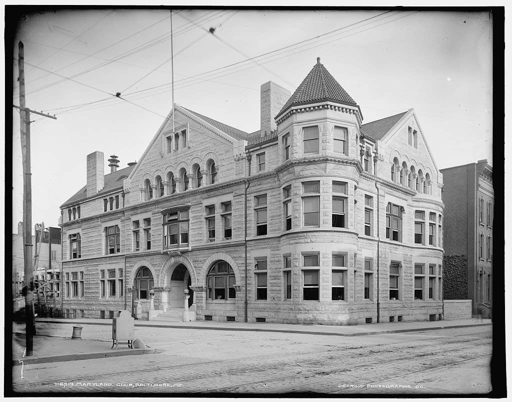 The Maryland Club formed in 1857, when workboats, sailing ships, and steamboats jammed Baltimore harbor. Political parties frequently met here to nominate candidates for President, and citizens proudly referred to the place as “the monumental city.” The new club chose as its first president a well educated lover of horse racing and nephew of the late French emperor, Napoleon Bonaparte. It eventually settled in an imposing house that Robert Mills had designed and that stood on the northeast corner of Franklin and Cathedral streets. Many members lived not far from the club house in the area still known as Mount Vernon Place. In early 1861 the club largely supported Confederate independence, although not necessarily Maryland secession. Unionist members for the most part resigned, President Bonaparte among them, but not Johns Hopkins, who shouldered an increased share of the club’s financial burden. When Union military forces took up positions in Baltimore that May, General Ben Butler allegedly threatened to shell the Maryland Club if city fathers quarreled with martial law. Soldiers later raided the club house, looking for hidden weapons, and eventually closed it.